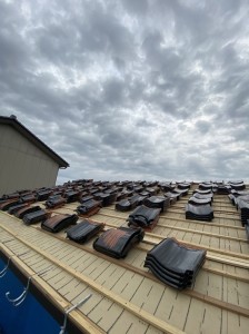 ④防災瓦施工(1枚1枚ステンレス釘にて留め付け、鉤施工、端口瓦はステンレスビス留め)